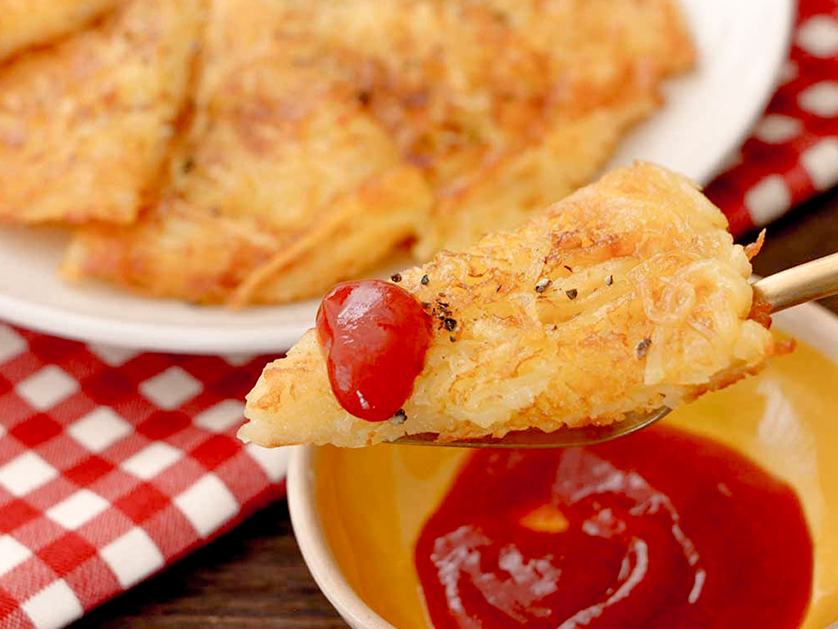 切ったじゃがいもは水にさらさなくてOK。そのまま焼くことで、つなぎを入れなくてもじゃがいものデンプンで生地がくっつきますよ。焼くときは蓋をせずヘラで押さえつけながら焼くことで、表面がこんがりカリッと仕上がります。